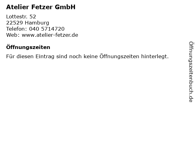 | Öffnungszeiten Atelier Fetzer GmbH in Hamburg anzeigen | |