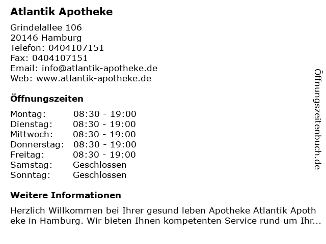 | Öffnungszeiten Atlantik Apotheke in Hamburg anzeigen | |