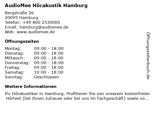 | Öffnungszeiten AudioMee Hörakustik Hamburg in Hamburg anzeigen | |