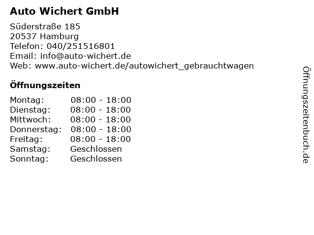 | Öffnungszeiten Auto Wichert GmbH in Hamburg anzeigen | |