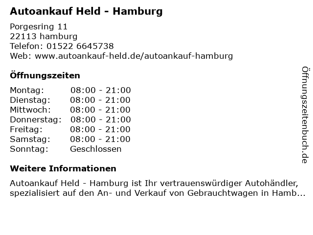 | Öffnungszeiten Autoankauf Held - Hamburg in hamburg anzeigen | |