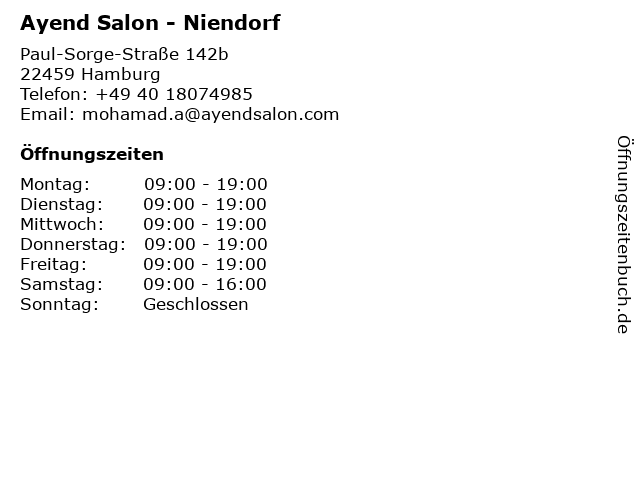 | Öffnungszeiten Ayend Salon - Niendorf in Hamburg anzeigen | |