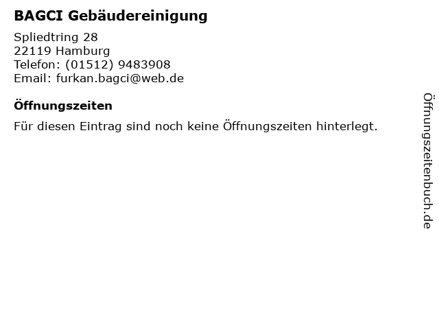 | Öffnungszeiten BAGCI Gebäudereinigung in Hamburg anzeigen | |