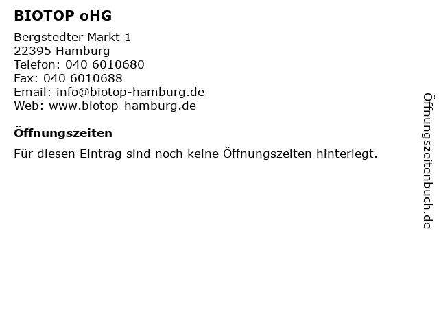 | Öffnungszeiten BIOTOP oHG in Hamburg anzeigen | |