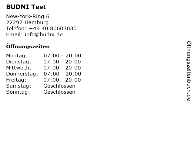 | Öffnungszeiten BUDNI Test in Hamburg anzeigen | |