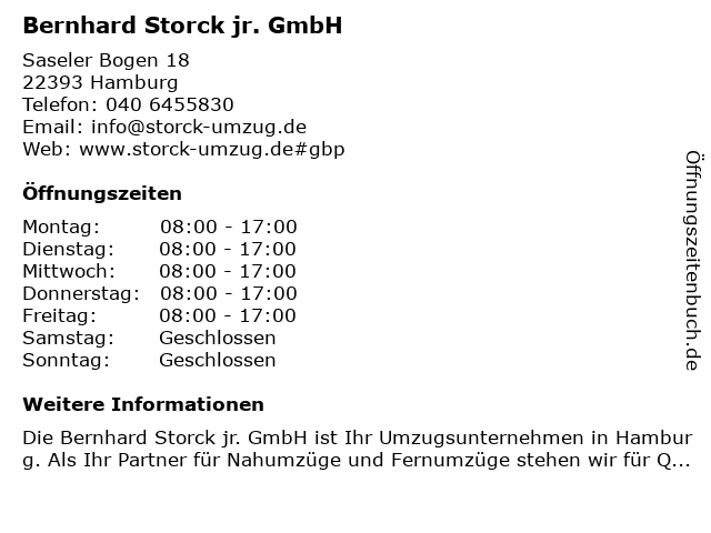 | Öffnungszeiten Bernhard Storck jr. GmbH in Hamburg anzeigen | |