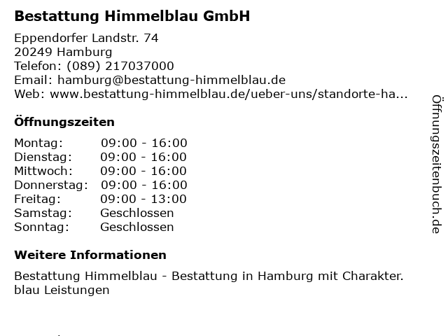 | Öffnungszeiten Bestattung Himmelblau GmbH in Hamburg anzeigen | |