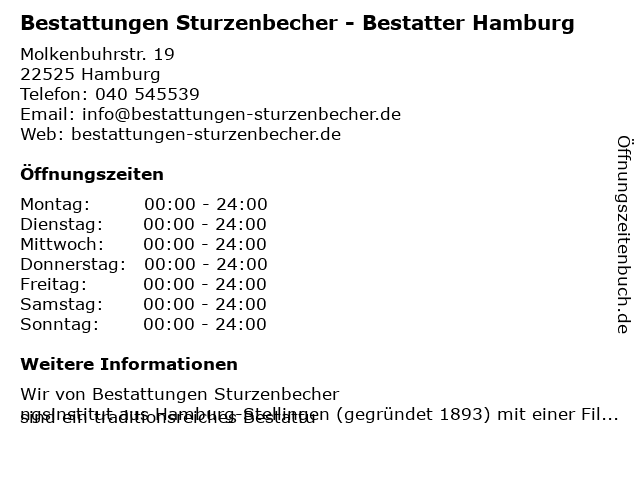 2 Sturzenbecher Bestattungen Erd-, Feuer- u. Seebestattungen (Entfernung: 0,00 km) Molkenbuhrstr 19, 22525 Hamburg 6 |