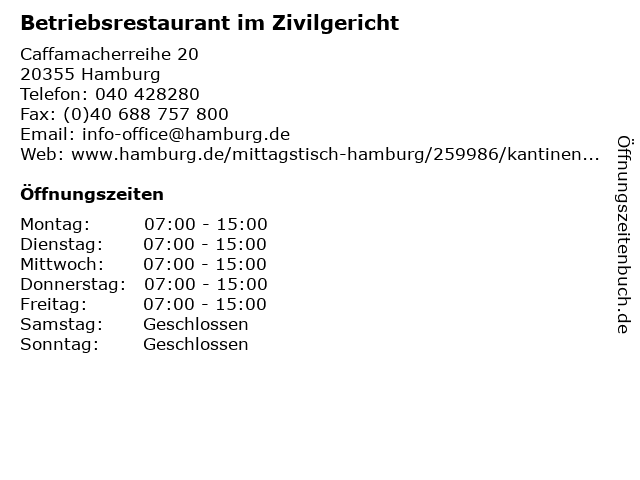 1 Bundesamt für Seeschifffahrt und Hydrographie - Kantine (Entfernung: 1,59 km) Bernhard-Nocht-Straße 78, 20359 Hamburg 6 |