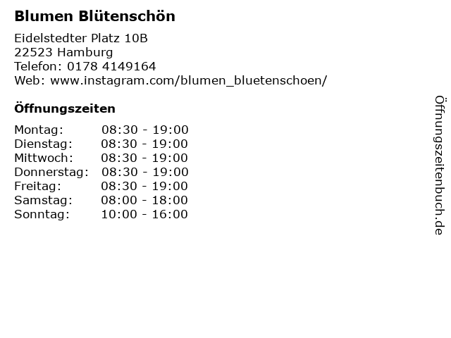 | Öffnungszeiten Blumen Blütenschön in Hamburg anzeigen | |