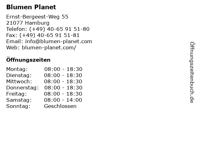 | Öffnungszeiten Blumen Planet in Hamburg anzeigen | |