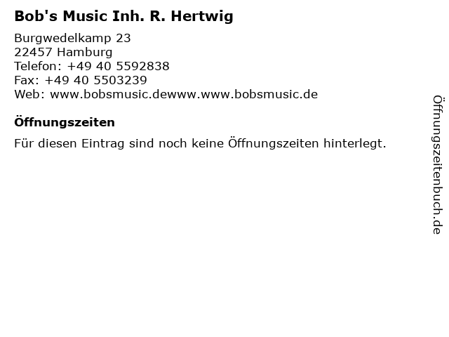 | Öffnungszeiten Bob's Music Inh. R. Hertwig in Hamburg anzeigen | |