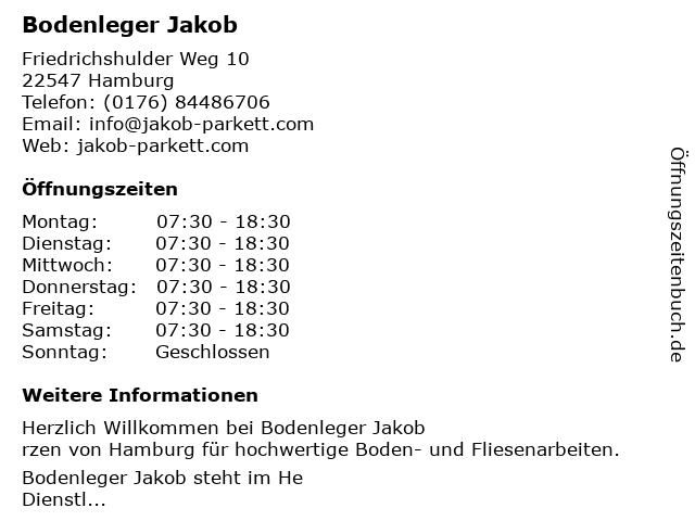 | Öffnungszeiten Bodenleger Jakob in Hamburg anzeigen | |