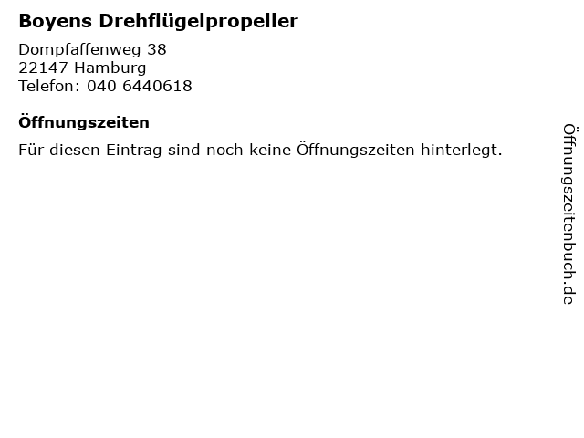| Öffnungszeiten Boyens Drehflügelpropeller in Hamburg anzeigen | |