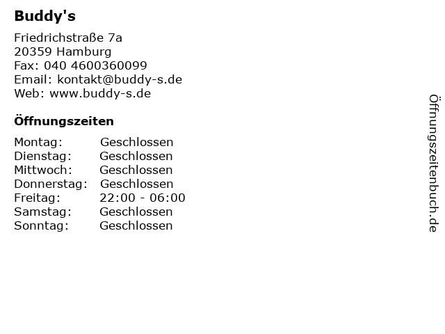 | Öffnungszeiten Buddy's in Hamburg anzeigen | |