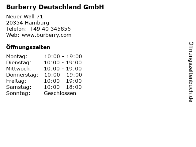 | Öffnungszeiten Burberry Deutschland GmbH in Hamburg anzeigen | |