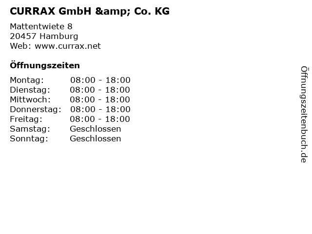 | Öffnungszeiten CURRAX GmbH & Co. KG in Hamburg anzeigen | |