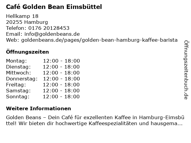 | Öffnungszeiten Café Golden Bean Eimsbüttel in Hamburg anzeigen | |