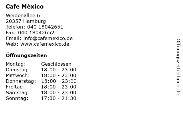| Öffnungszeiten Cafe México in Hamburg anzeigen | |