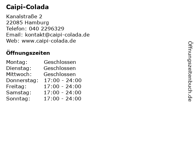 | Öffnungszeiten Caipi-Colada in Hamburg anzeigen | |