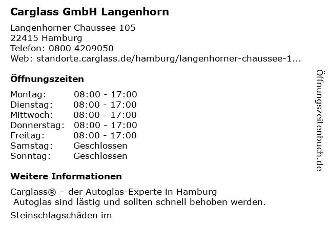 | Öffnungszeiten Carglass GmbH Langenhorn in Hamburg anzeigen | |