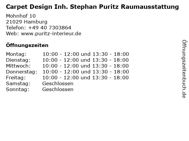 1 Carpet Design Inh. Stephan Puritz Raumasstatung (Entfernung: 0,10 km) Wentorfer Str. 11, 21029 Hamburg 6 |