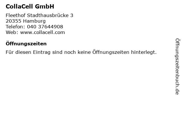 | Öffnungszeiten CollaCell GmbH in Hamburg anzeigen | |