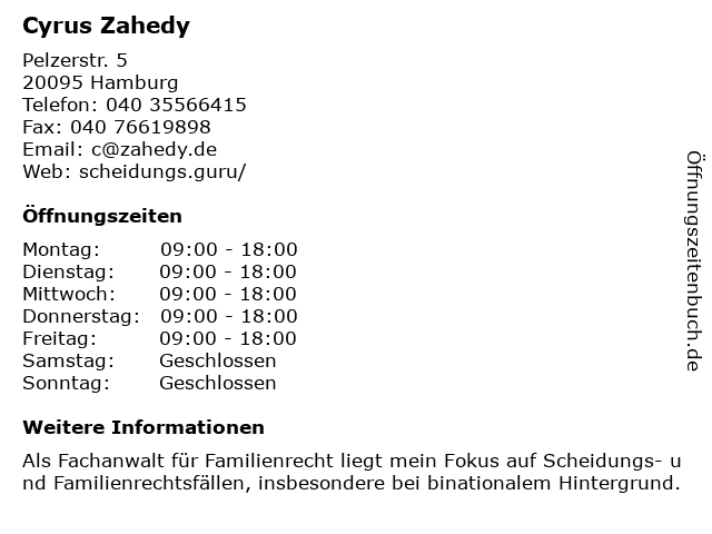 | Öffnungszeiten Cyrus Zahedy in Hamburg anzeigen | |