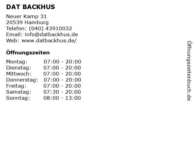 | Öffnungszeiten DAT BACKHUS in Hamburg anzeigen | |
