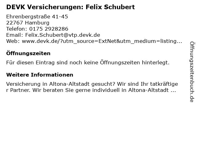 3 DEVK Versicherungen Regionaldirektion Hamburg (Entfernung: 0,01 km) Ehrenbergstrasse 41-45, 22767 Hamburg 4 DEVK Generalagentur Vermittlung von Versicherungen (Entfernung: 6,63 km) Elbgaustraße 112, 22547 Hamburg 6 |