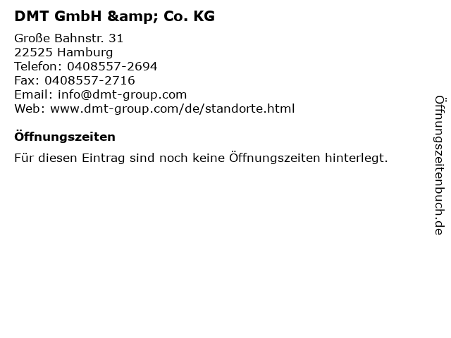 | Öffnungszeiten DMT GmbH & Co. KG in Hamburg anzeigen | |