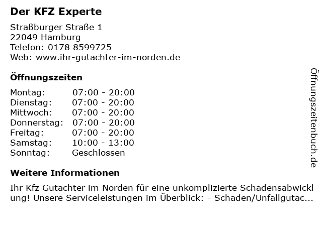 | Öffnungszeiten Der KFZ Experte in Hamburg anzeigen | |