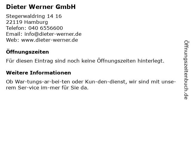 | Öffnungszeiten Dieter Werner GmbH in Hamburg anzeigen | |