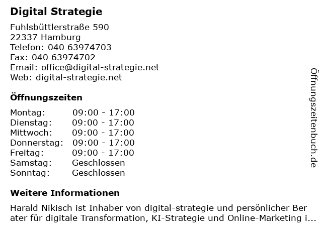 | Öffnungszeiten Digital Strategie in Hamburg anzeigen | |