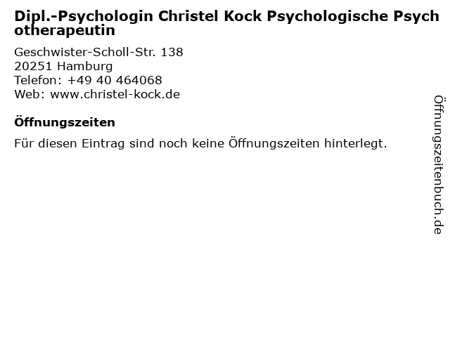 | Dipl.-Psychologin Christel Kock Psychologische Psychotherapeutin anrufen | |