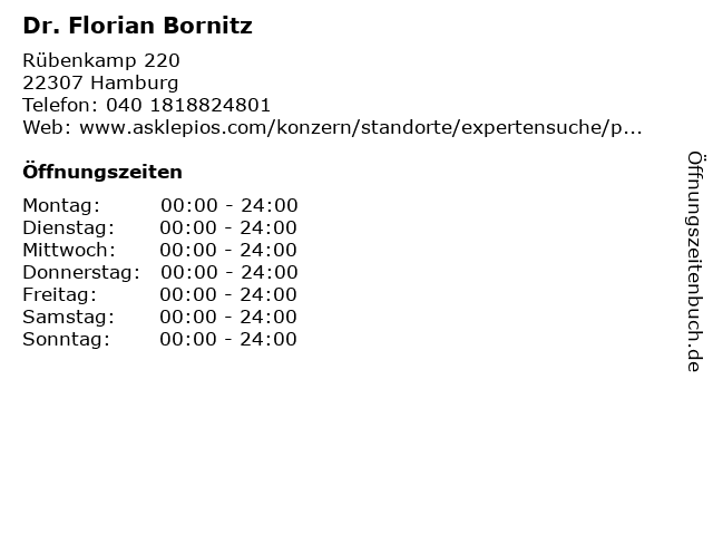 | Öffnungszeiten Dr. Florian Bornitz in Hamburg anzeigen | |