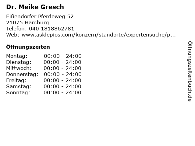 | Öffnungszeiten Dr. Meike Gresch in Hamburg anzeigen | |