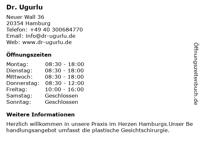 | Öffnungszeiten Dr. Ugurlu in Hamburg anzeigen | |