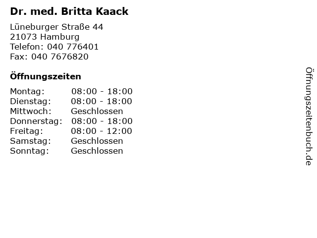 | Öffnungszeiten Dr. med. Britta Kaack in Hamburg anzeigen | |