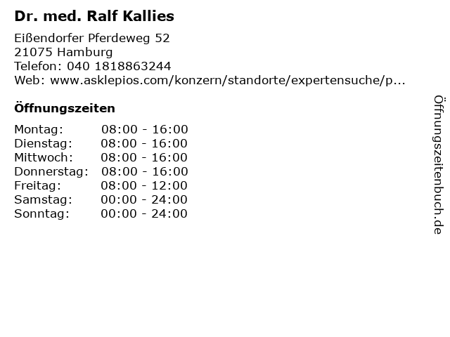 | Öffnungszeiten Dr. med. Ralf Kallies in Hamburg anzeigen | |