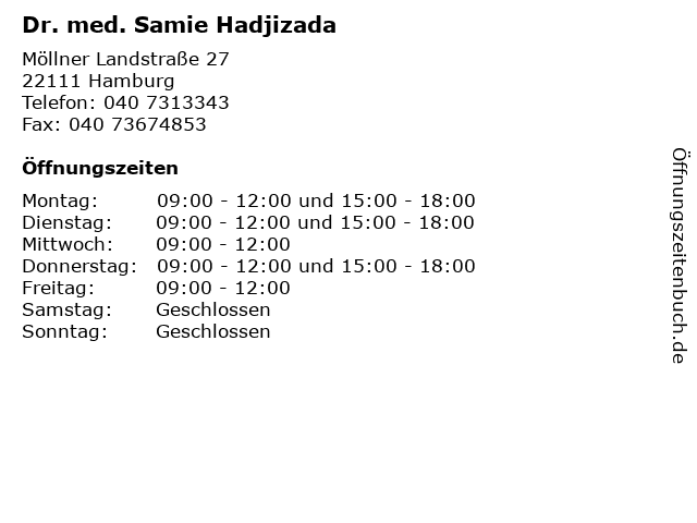 | Öffnungszeiten Dr. med. Samie Hadjizada in Hamburg anzeigen | |