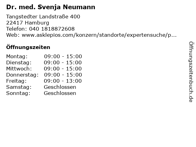 Öffnungszeiten Dr. med. Svenja Neumann in Hamburg anzeigen | |