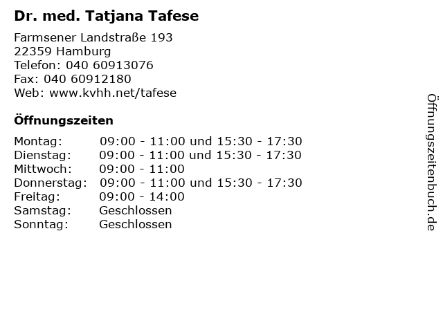 | Öffnungszeiten Dr. med. Tatjana Tafese in Hamburg anzeigen | |