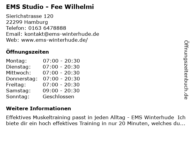 | Öffnungszeiten EMS Studio - Fee Wilhelmi in Hamburg anzeigen | |