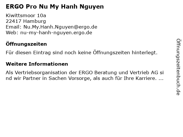 | Öffnungszeiten ERGO Pro Nu My Hanh Nguyen in Hamburg anzeigen | |