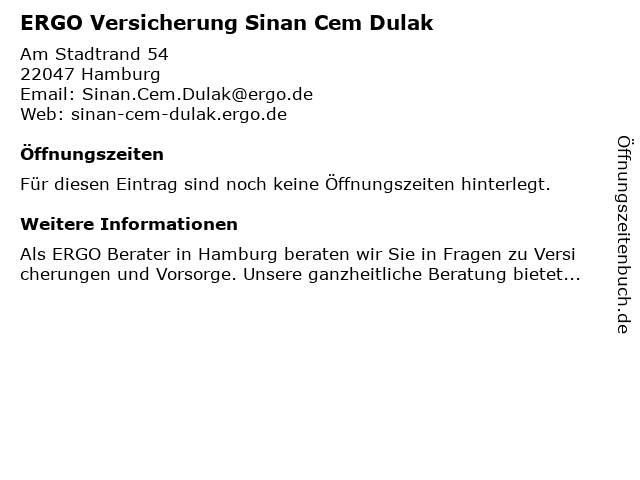 | Öffnungszeiten ERGO Versicherung Sinan Cem Dulak in Hamburg anzeigen | |