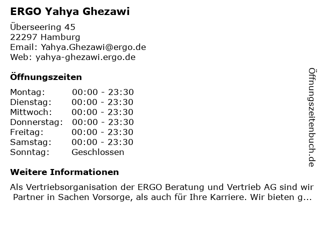 | Öffnungszeiten ERGO Yahya Ghezawi in Hamburg anzeigen | |