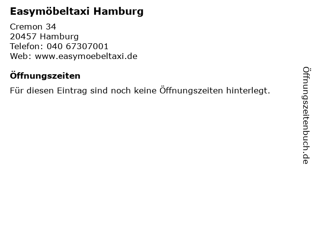 | Öffnungszeiten Easymöbeltaxi Hamburg in Hamburg anzeigen | |