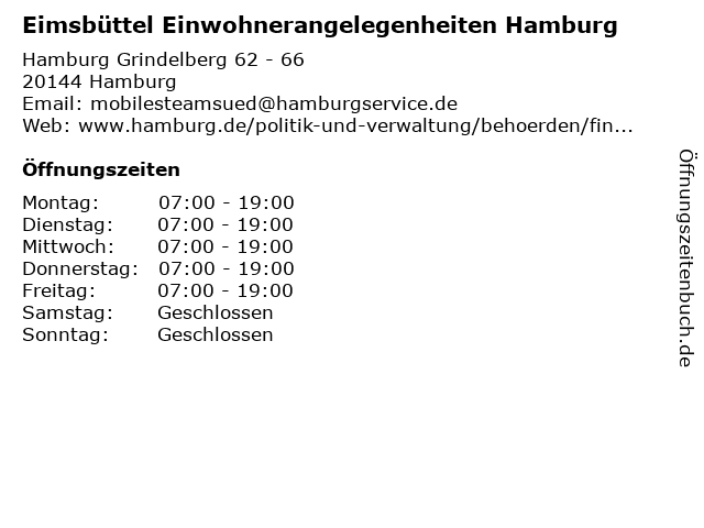 | Öffnungszeiten Eimsbüttel Einwohnerangelegenheiten Hamburg in Hamburg anzeigen | |