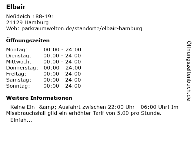 | Öffnungszeiten Elbair in Hamburg anzeigen | |